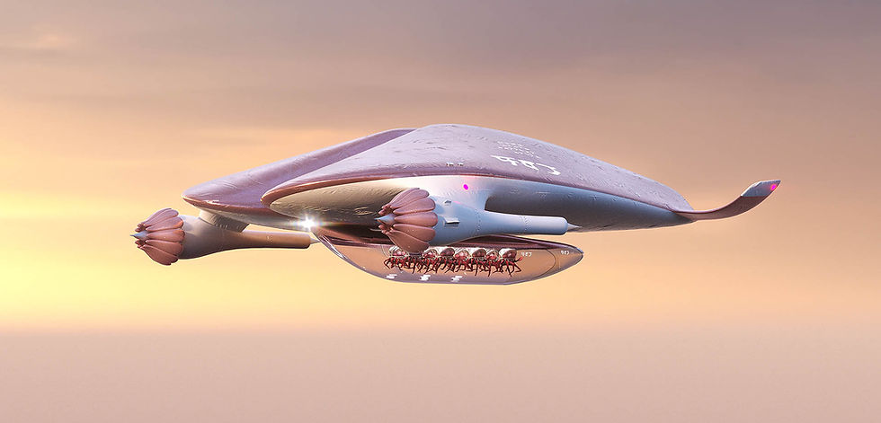 △ VEHICLE DESIGN | AIRSHIP | Somewhere between a plane and an airship this vehicle uniquely fits this planets atmosphere and the airfloater creatures body plan that have invented it.